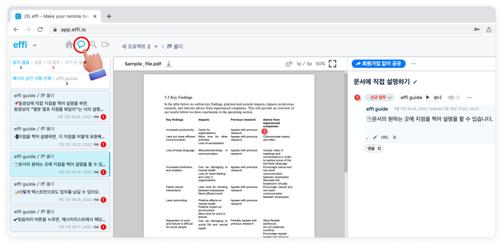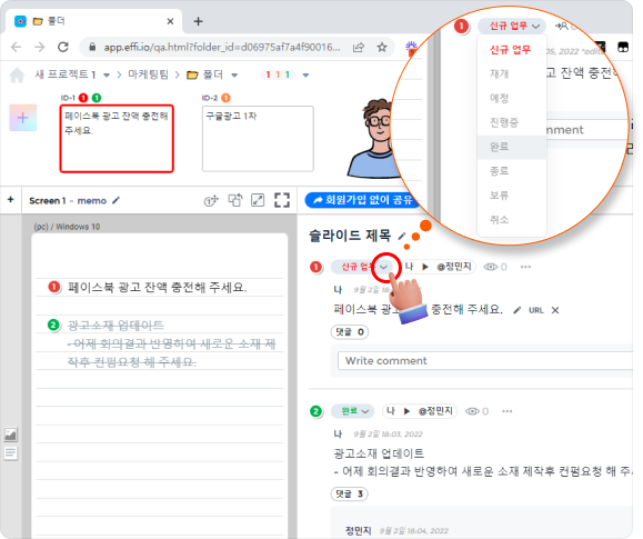 할당받은 업무와 댓글을 한 곳에서 확인할 수 있습니다.